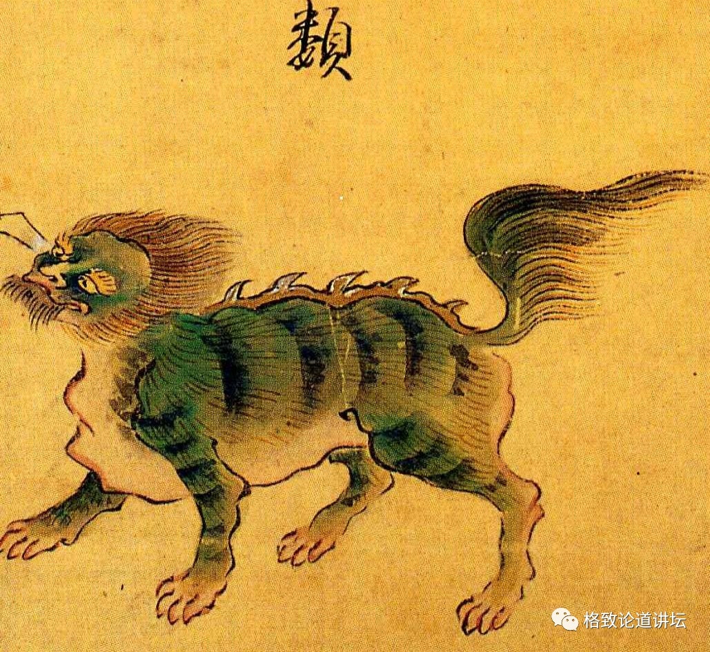 《山海经》里也不全都是妖怪,比如“类”。《山海经》的第一篇是《南山经》,《南山经》里有一座山——亶爰之山,这座山上有一个怪兽,名字叫类。它的形状像狸猫,背上有鬃毛,像下图中所展示的狮子头似的。